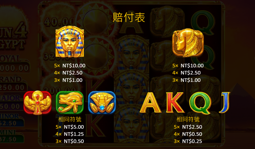 包括法老王、金字塔、埃及寶藏等,象徵埃及文明的圖案,對應不同的賠付倍率。